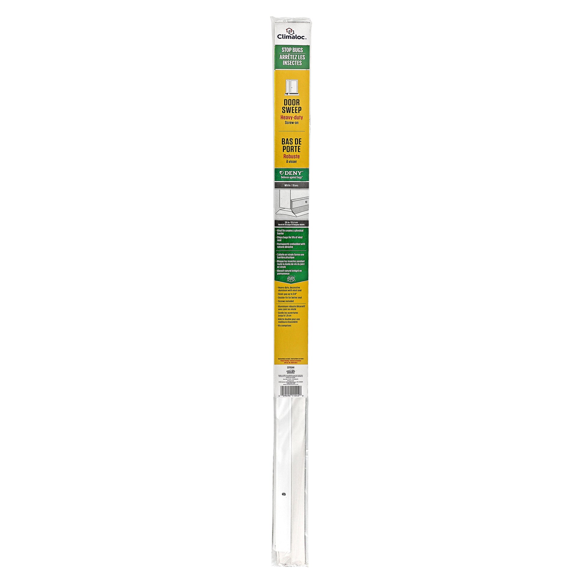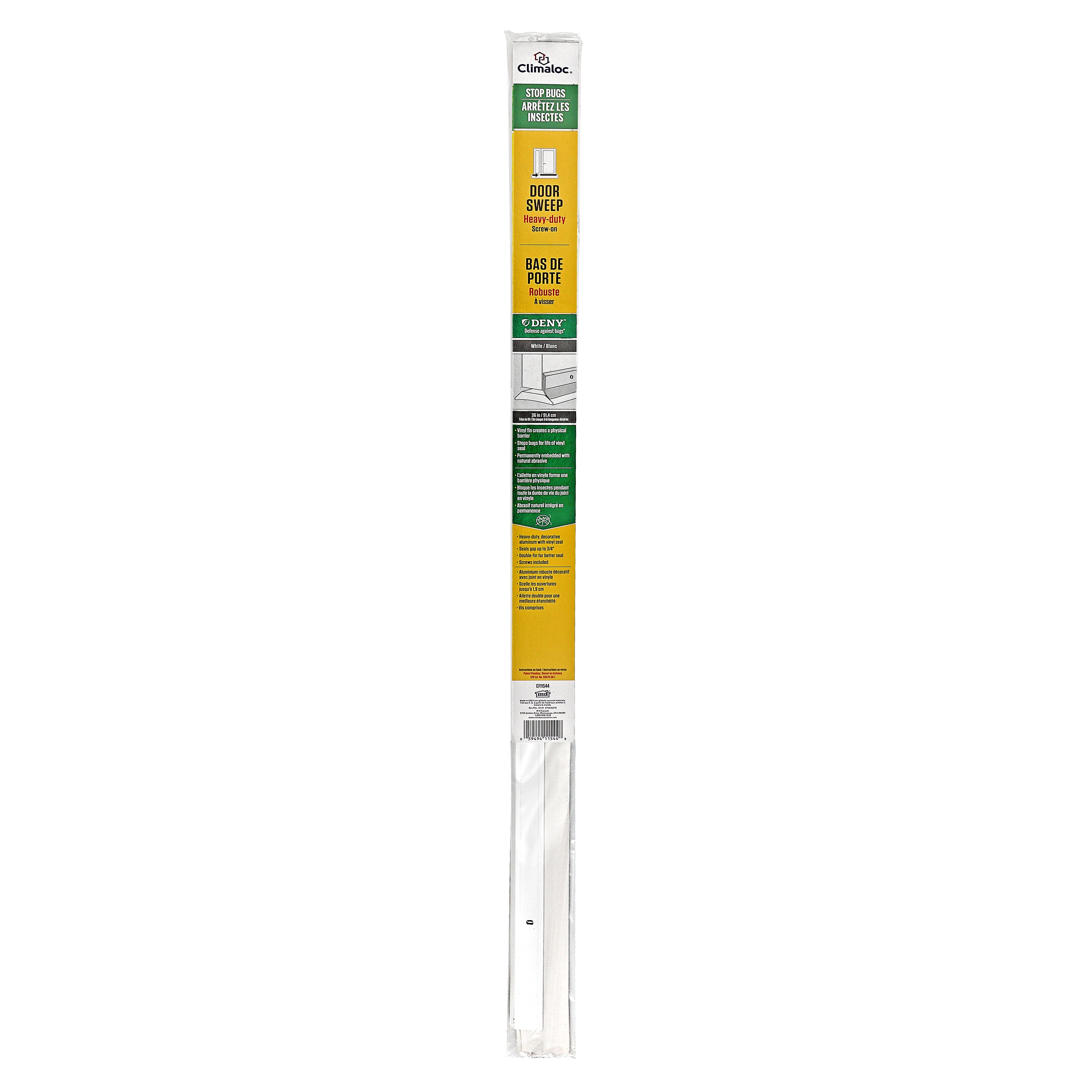 The Climaloc Aluminum and Vinyl Heavy-duty Screw-on Door Sweep features a vinyl seal for protection from drafts, moisture, dust and insects. The vinyl seal provides a physical barrier to stop bugs and is embedded with a natural abrasive. Save on energy by sealing the bottom of the door and keeping the heat or air conditioning from escaping. All of the hardware needed to install is included. Before installation, cut to desired length by using a hacksaw.