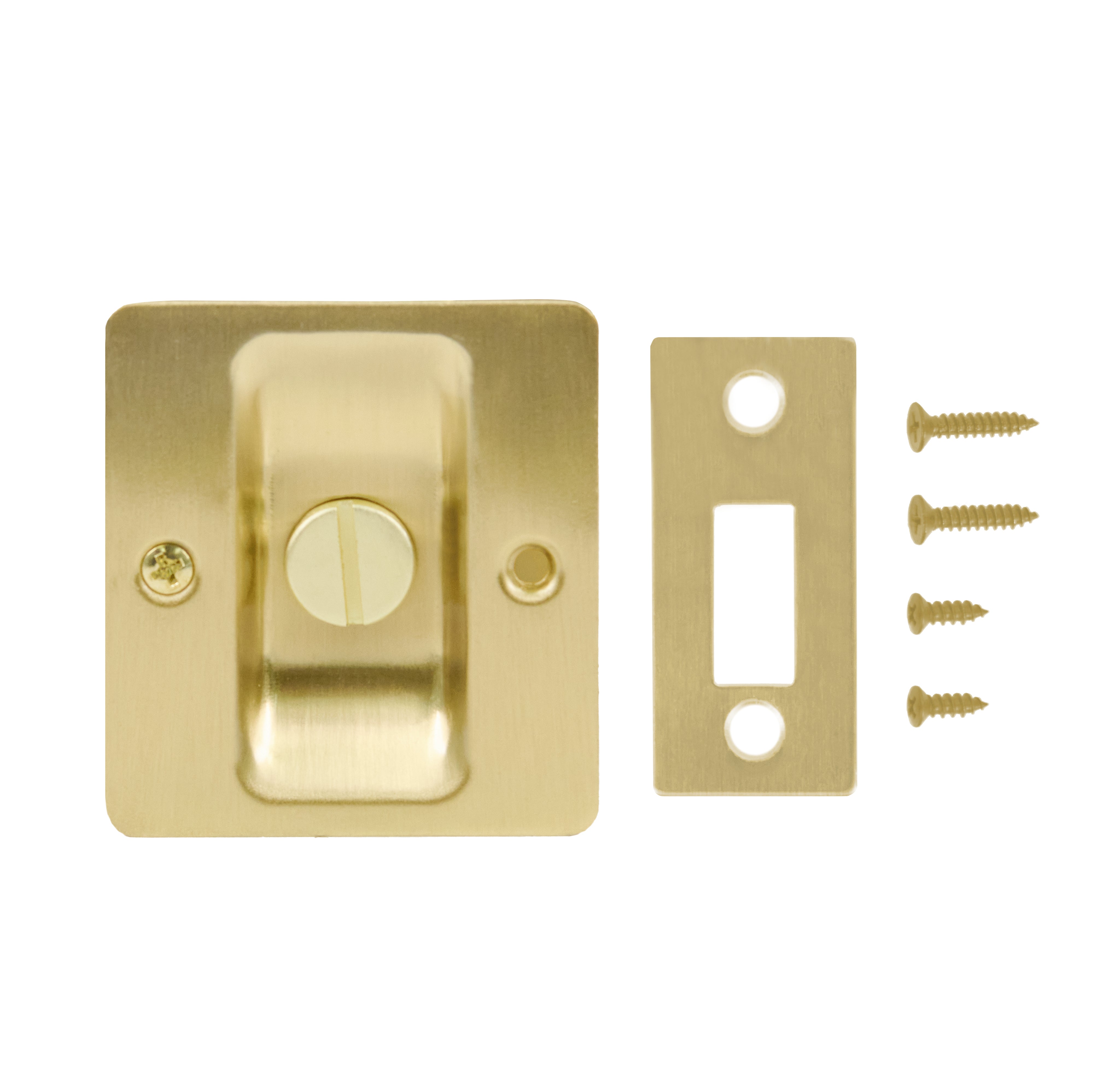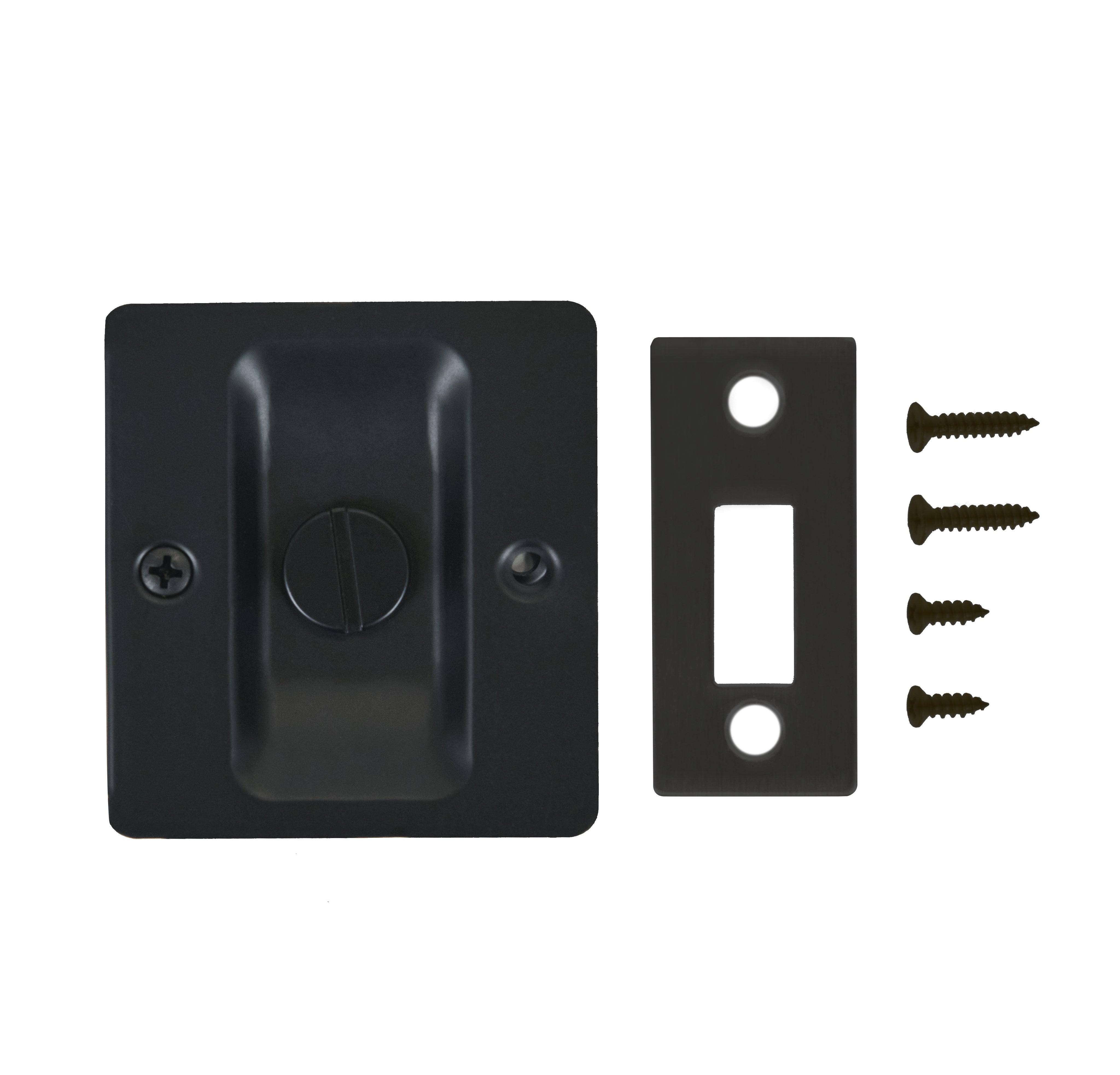 M-D Building Products square privacy pocket door pull. Steel construction and easy installation. Use on interior pocket doors where privacy lock is required such as bathroom or bedroom. Designed for left or right-handed installations. Compatible on doors 1-3/8" and 1-3/4" thick. 2-3/4" mortise required on door panel for installation.