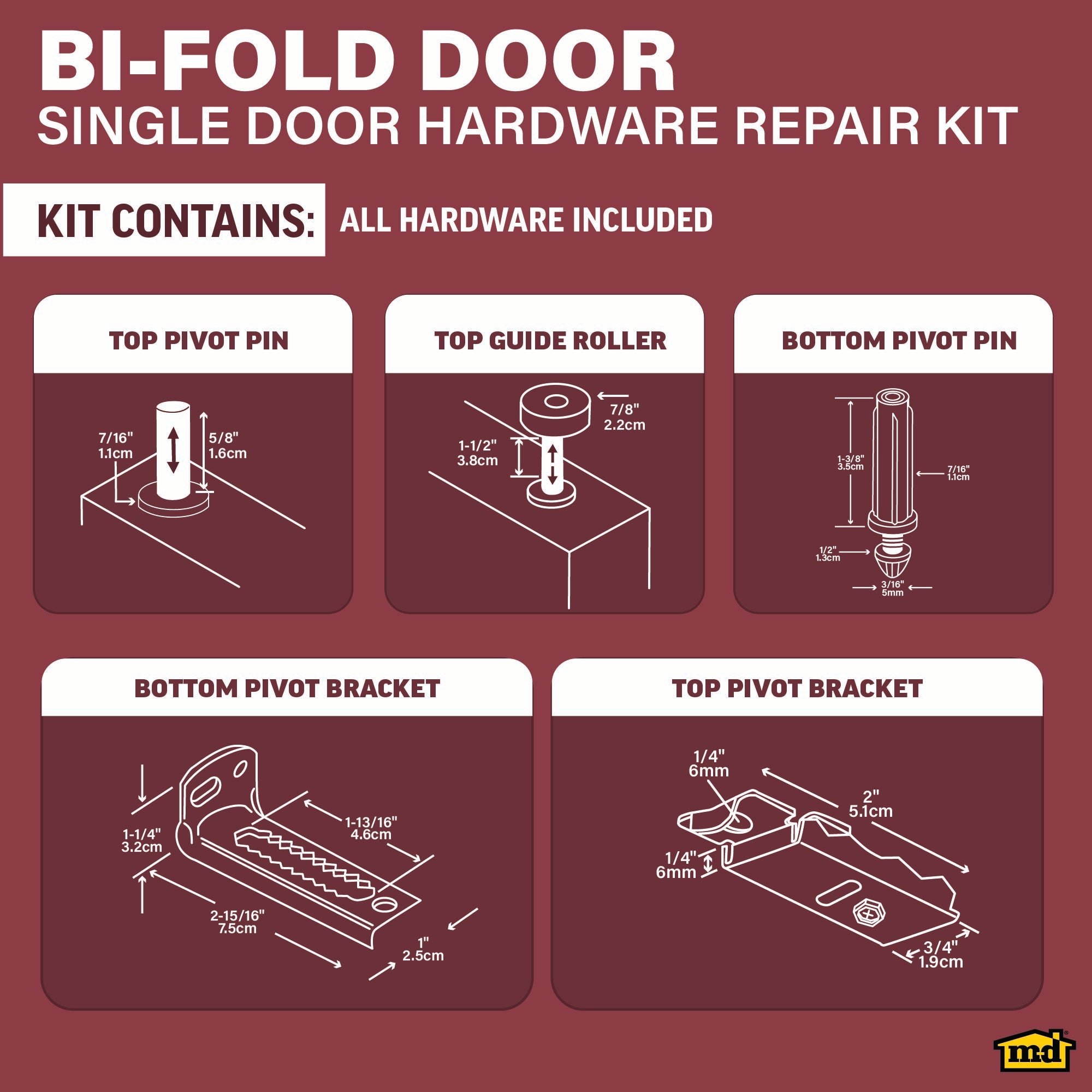 M-D Building Products bi-fold closet door pivot pins, brackets and guide roller set. Components to replace all pivot pins and brackets and top guide roller for bi-fold closet doors. Top guide roller and brackey fit any 7/8" track. Bottom pivot pin has a tapered groove tip that allows for horizontal adjustment with the bottom pivot bracket. Four way alignment adjustment capabilities. Compatible with all M-D Building Products B-fold Track and Hardware Set.